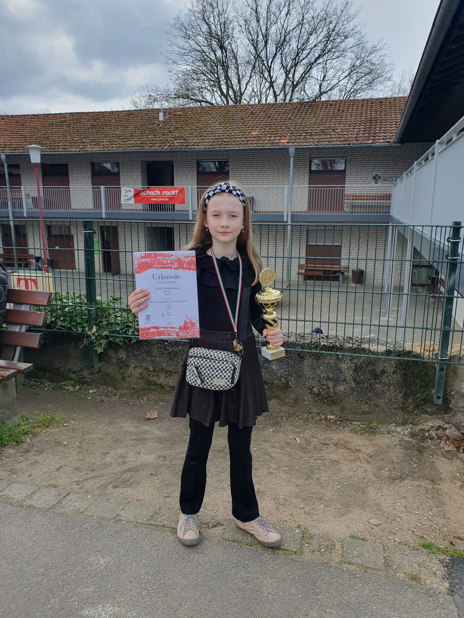Lily spielte an Brett 1 ihrer Mannschaft in der U12w und bekam es in der zweiten Runde gleich mit ihrer Dauerkonkurrentin Daria Shynkar von der Schachakademie Paderborn zu tun. Einen Eröffnungsfehler Darias konnte Lily ausnutzen und sie daran hindern, ihren König mittels Rochade aus der Brettmitte zu evakuieren, daraufhin öffnete sie das Zentrum und setzte Daria matt. Ein großer Erfolg, und es lief weiterhin hervorragend. In der 6. Runde spielte sie eine Mammutpartie gegen Ailin Rafikova, WM-Teilnehmerin dieses Jahres. Ailin überraschte Lily in der Eröffnung und hoffte darauf, dass sie nicht die besten Züge finden würde. Lily fasste aber einen klaren Plan, erarbeitete sich Vorteile und nahm der Gegnerin jegliche Aussicht auf Gegenspiel. Paralysiert fand Ailin irgendwann keine Verteidigung mehr gegen Lilys Angriffe und verlor nach 3 Stunden und 50 Minuten Spielzeit die letzte noch laufende Partie der Runde. Am Ende standen bei Lily 7 Siege aus 7 Partien auf dem Tableau und sie wurde als Brettmeisterin von der Präsidentin des Deutschen Schachbunds Ingrid Lauterbach ausgezeichnet. Ihre Mannschaft landete auf dem 4. Platz, es gewannen die Schachakademikerinnen aus Paderborn.