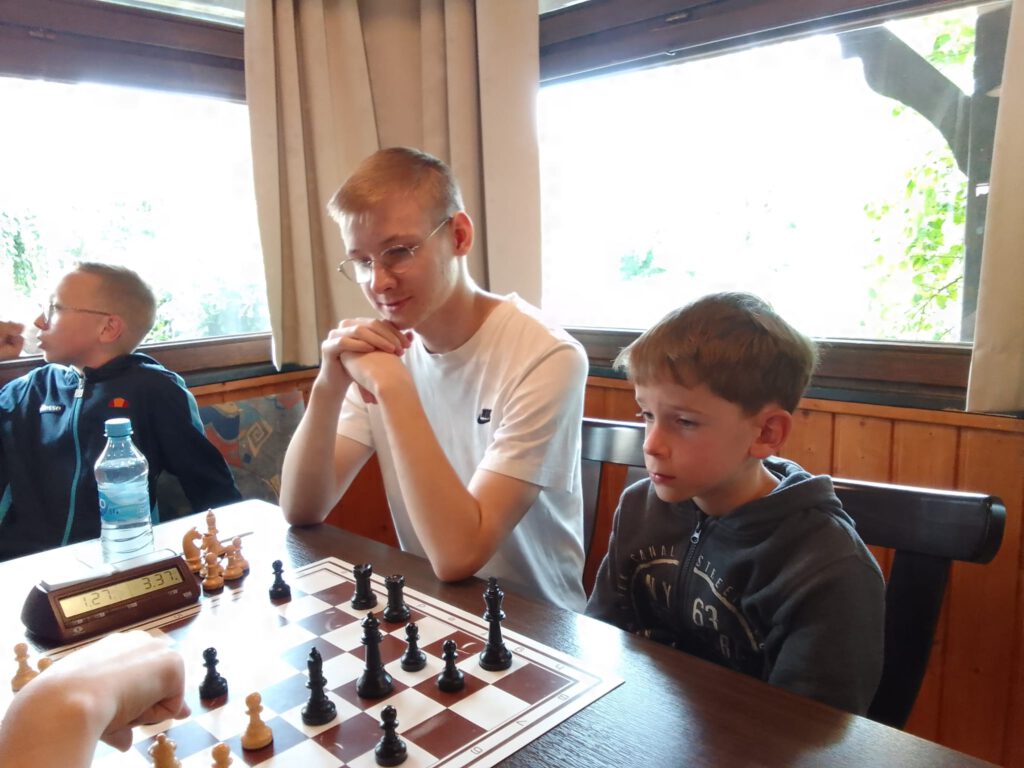 Laurenz (hier gegen Manfred Fechner, der wieder mit seinem Bruder Werner angereist war) war mit seinem Turnier wohl nicht ganz zufrieden. Obwohl er in der ersten Runde gegen Magnus Winter gewinnen konnte, der immerhin fast 1800 Punkte stark ist, ging in den Runden danach nichts mehr. Am Ende standen immerhin noch zwei Pflichtsiege auf dem Tableau. Trotzdem: Da wäre auch noch mehr drin gewesen.