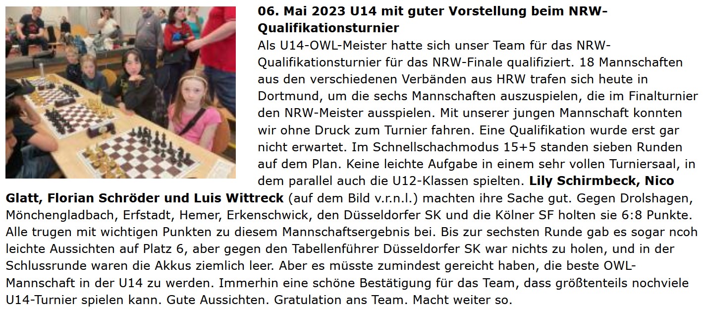 Viele unserer Jugendschachler waren in der 1. Januarwoche bei der OWL Meisterschaft aktiv. Es spielten Luca und Luka-Joel in der U10, Oleh in der U12 und Florian in der Altersklasse U14. Luka-Joel hat in der U10 einen beachtlichen 4. Platz belegt und ist nur knapp an der NRW Meisterschaftsqualifikation vorbei geschrammt. Oleh hat sich in der U12 wohl etwas mehr als seinen 10. Platz erhofft, seine beachtliche Spielstärke im Blitz- und Schnellschach kann er bisher leider nicht in klassische Partien umsetzen. Florian spielte im Rahmen der Erwartungen und belegte den 5. Platz. Ihor hat zudem am Einsteigerturnier teilnehmen und ist dort zweiter geworden.