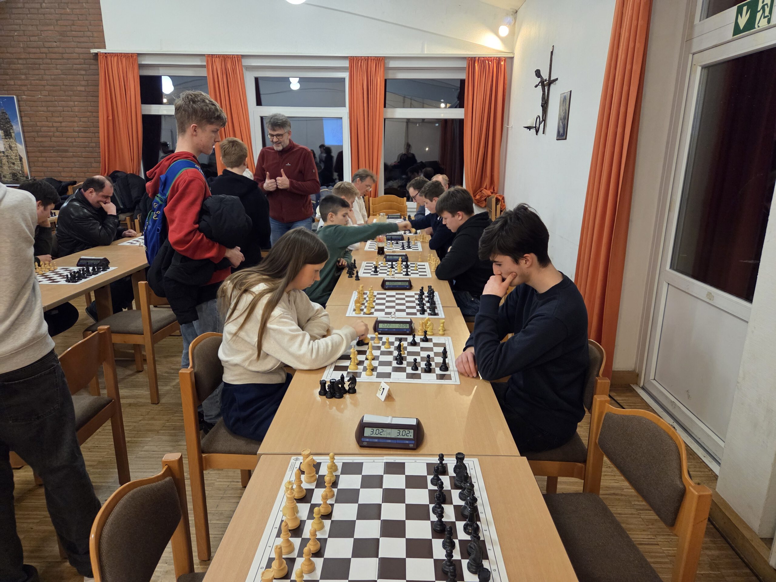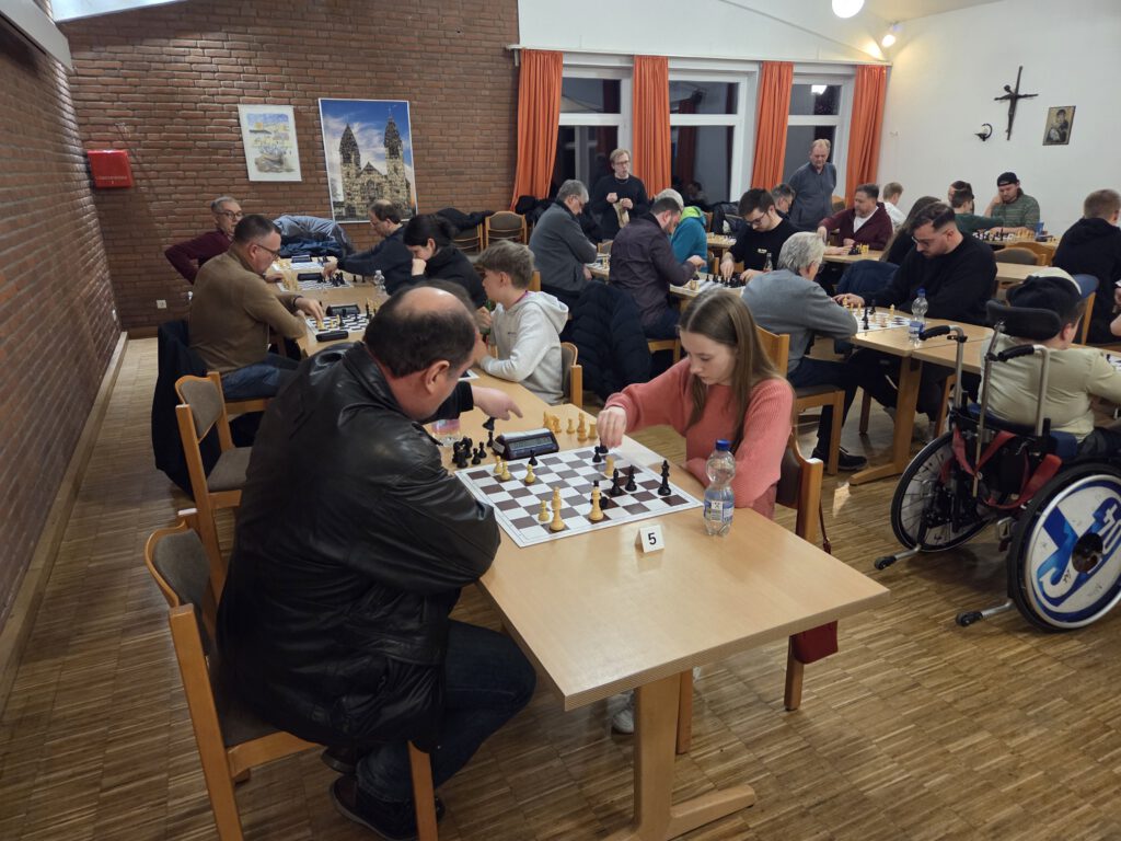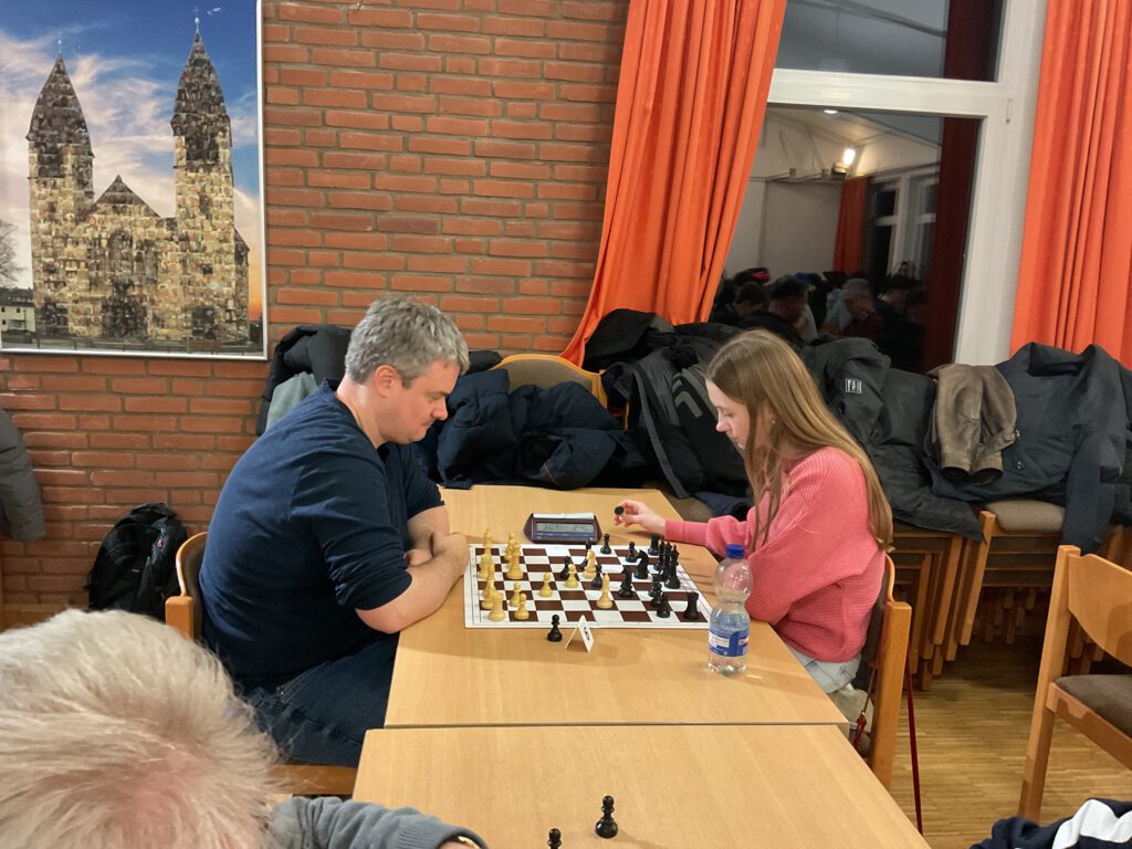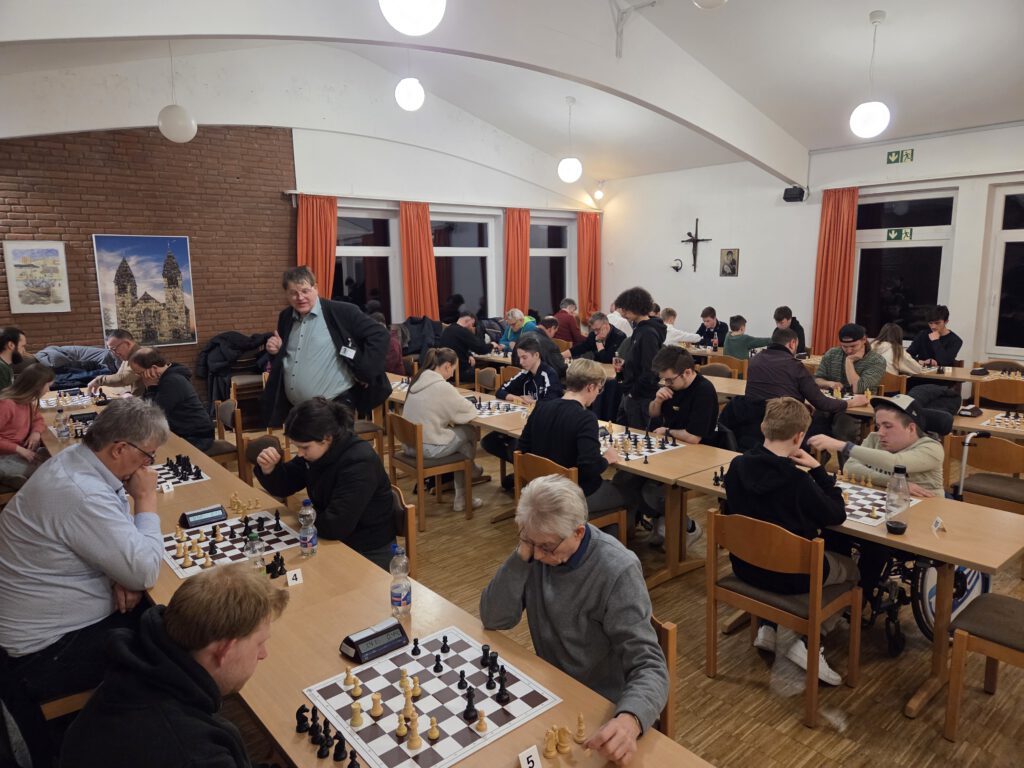 Ein paar ganz neue Gesichter, nicht nur beim Teutopokal sondern ganz allgemein bei Schachturnieren OTB, waren auch kennenzulernen: Im Vordergrund rechts spielt Andrea Vesho Remis gegen Lotta Kowalzik. Er hat gegen ELO-Inhaber gepunktet, daher wird es wohl eine erste ELO geben. Emin Alper Oezguec im Duell mit dem Lager Moritz Wagner (links neben Lotta) spielte noch besseres Schach bei seinem ersten Turnier (habe ich selbst erfahren dürfen, mein Sieg war sehr mühevoll). Er erspielte eine ELO Performance von 1621.