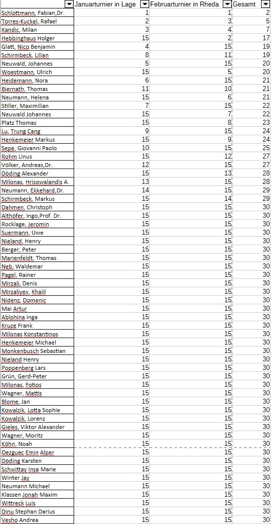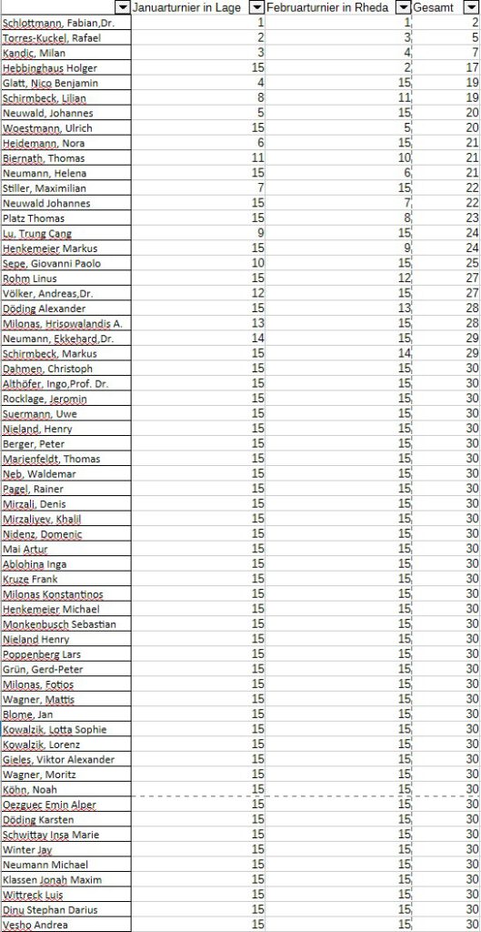 Die Gesamttabelle nach der 2. Runde. Fabian führt nach 2 Turniersiegen das Feld an. Wenn er weiterhin regelmäßig mitspielt, und nicht Matthias Blübaum o.ä. überraschenderweise auftauchen sollte, gibt es einen klaren Favoriten für den Gesamtsieg beim Teutopokal 2026. Spieler, die Turniere auslassen, bekommen für diese in der Zwischenwertung pauschal 15 Punkte gutgeschrieben. Am Ende werde ich dann die zwei schlechtesten Ergebnisse streichen.